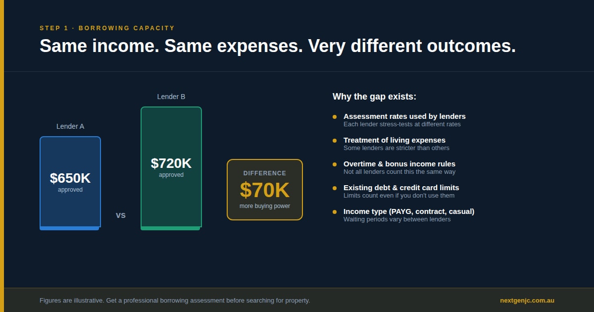 Your borrowing capacity isn’t fixed—it varies significantly between lenders. One lender might approve you for $650,000 while another offers $720,000 for the exact same income and expenses. Why? Because each lender has different:
