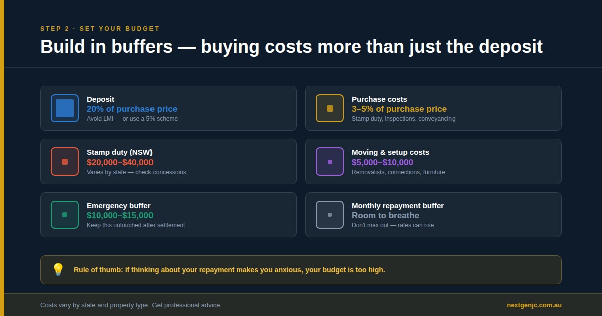 - Deposit: Ideally 20% to avoid LMI, but there are legitimate strategies for buying with 5-10% (more on this in Article 3)