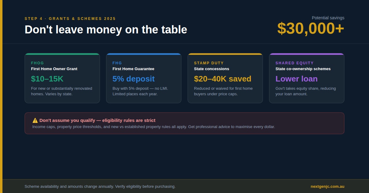 The catch? These schemes have specific eligibility requirements around income thresholds, property prices, and whether you’re buying new or established properties. You need to know which schemes you qualify for before you start looking at properties.