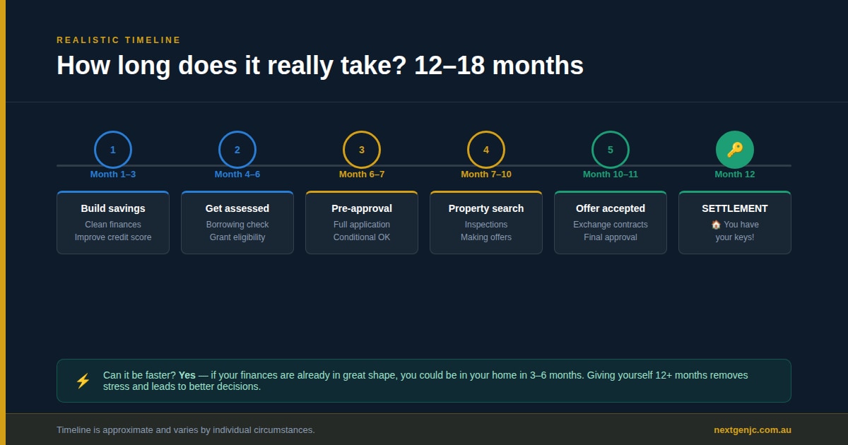 Can it be faster? Absolutely. If your finances are already in great shape and you’re pre-approved, you could be in your home within 3-6 months. But for most first home buyers, giving yourself 12+ months removes stress and allows you to make better decisions.
